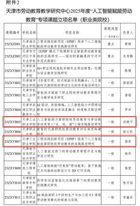 近日,天津市劳动教育教学研究中心公布了2025年度“人工智能赋能劳动教育”专项课题立项结果,我校申报的两项课题成功获批立项,课题编号分别为25ZXYB05、25ZXYB07,标志着我校在人工智能与劳动教育融合研究领域取得新突破。