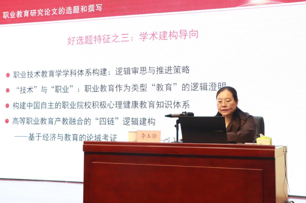 讲座中,李玉静副总编辑以“新形势下如何开展高质量的职业教育研究”为主题,结合自身丰富的编辑经验和深厚的学术底蕴,进行了系统而深入的讲解。她首先分析了当前职业教育研究的热点趋势与政策导向,为教师们指明了选题方向。随后,她聚焦职业教育研究论文写作的核心环节,通过论文背景、内涵、选题、撰写、未来趋势五个部分逐一剖析,层层递进,提供了极具操作性的指导。最后,李玉静副总编发布了2025年度《职业技术教育》选题和2026年度选题方向,为老师们做好论文研究方向选题提供了重要指导和参考。